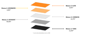 Terug naar de vraag: hoeveel bedrijven hebben een sterke of zwakke bedrijfscultuur. Het Amerikaanse Inc., een bedrijf dat jaarlijks onderzoek doet naar de succesvolste en meeste aantrekkelijke bedrijven in de V.S. , vergelijk het met wat Intermediair en Managent Team hier in NL doen – heeft in 2018 honderden bedrijven doorgemeten op de kracht van de bedrijfscultuur. Zij onderscheiden 5 levels van bedrijfscultuur: toxic, deficient, common, advanced en elite. De verdeling van de onderzochte bedrijven over deze 5 niveaus was als volgt: